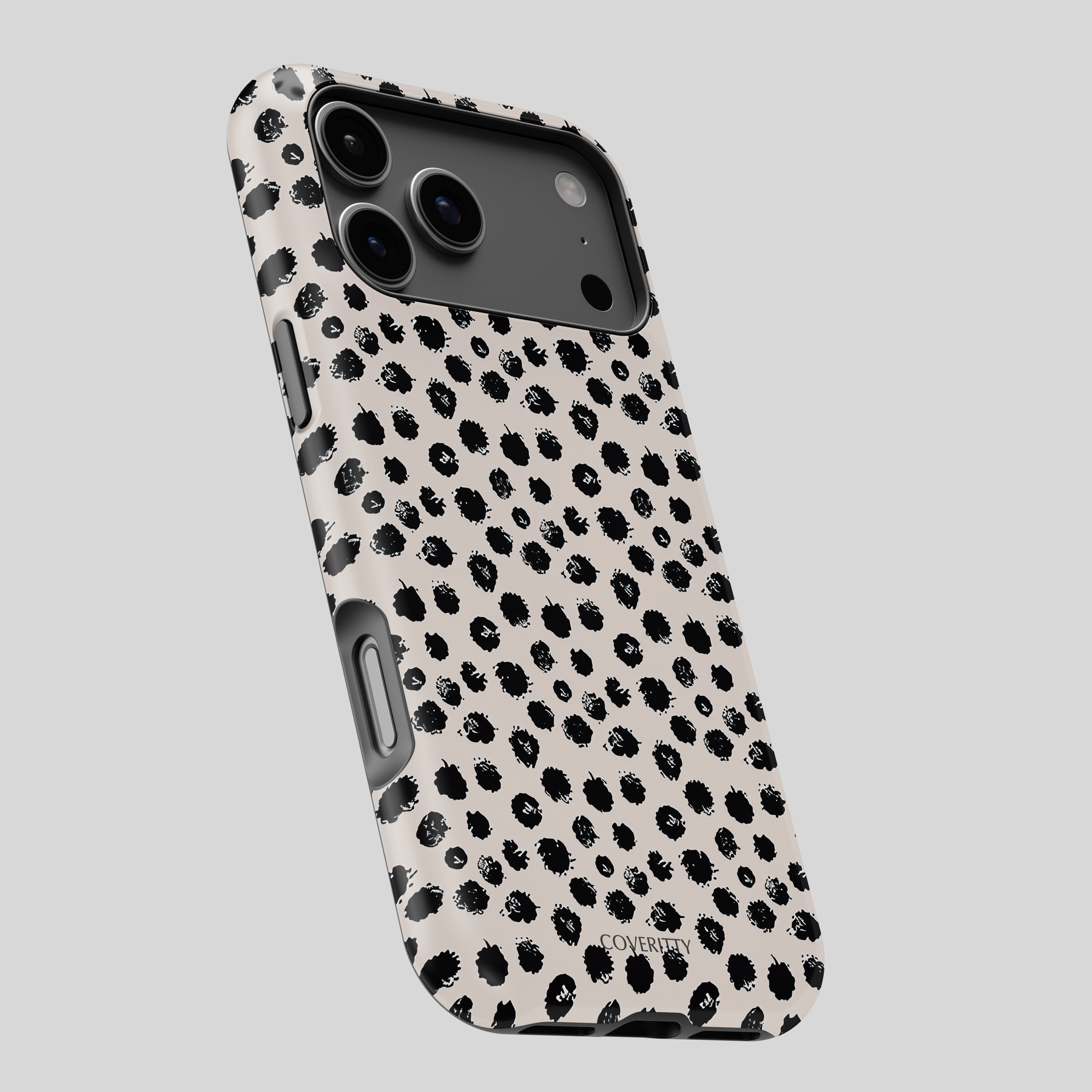 Make a statement with Elegant Splash, where modern art meets timeless sophistication. This case features a soft beige background adorned with expressive black splatter dots, creating a refined yet playful aesthetic that complements any look.